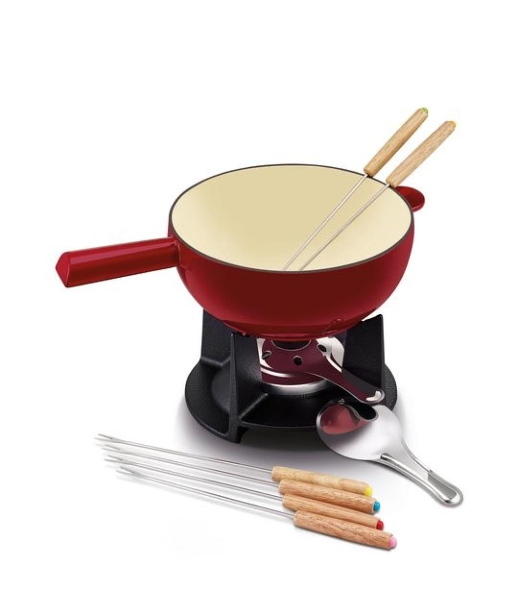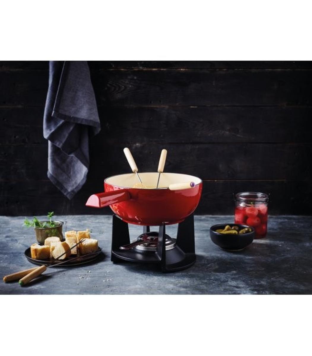 – Inkluderer 6 fargekodede gafler, gryte, stativ og brenner