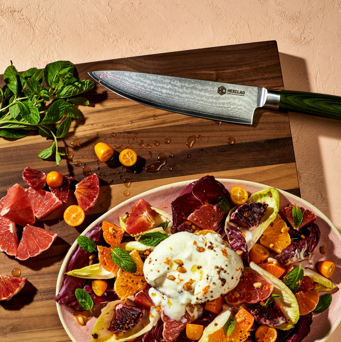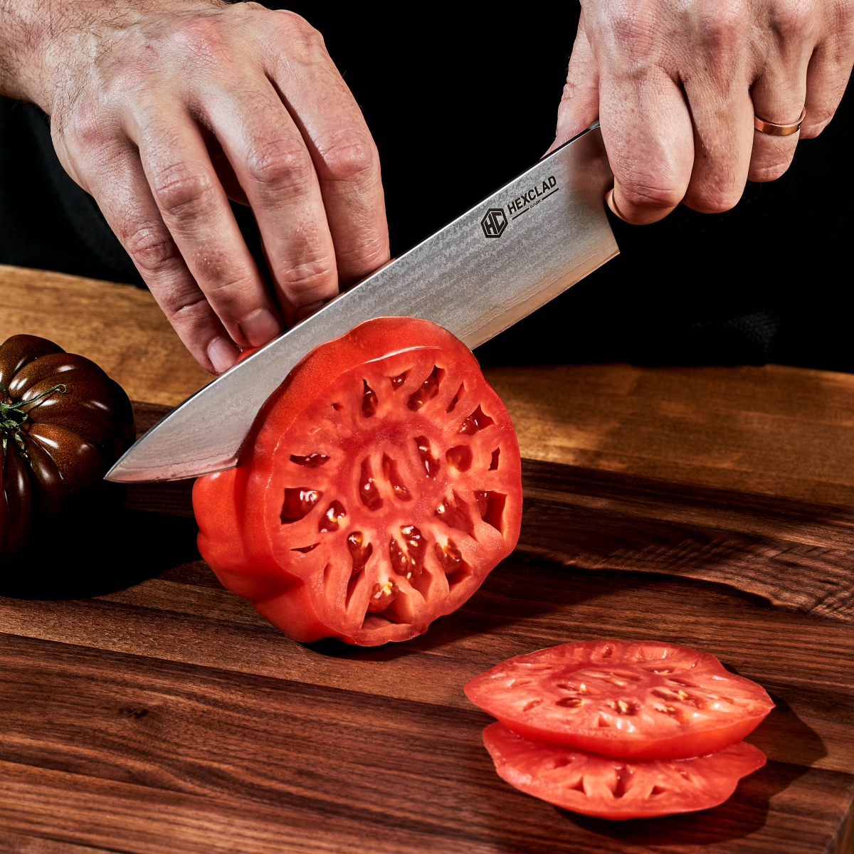 Hexclads 20 cm kokkekniv i damask-stål er en ekte allrounder – en kraftfull og presis kniv som gjør alt fra å kutte harde grønnsaker til å finskjære kjøtt til en uanstrengt opplevelse. Den er smidd i 67 lag japansk damaskusstål, med en hardhet på 60 HRC, noe som gir en kniv med imponerende styrke, slitestyrke og sylskarp egg.