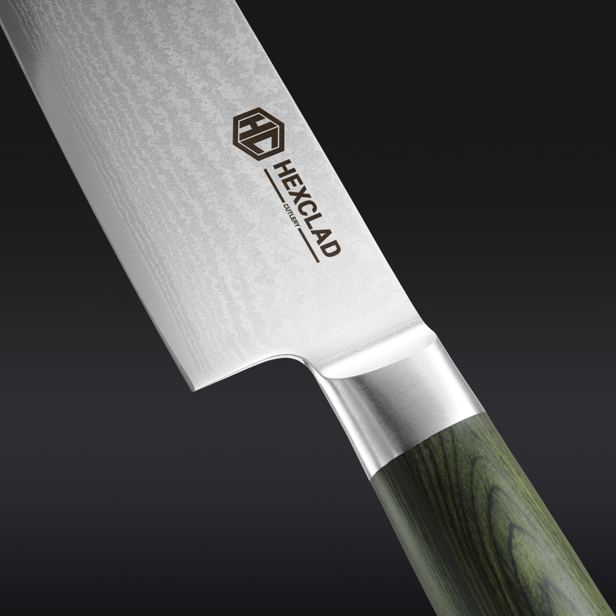 Kniven er perfekt balansert og utstyrt med et ergonomisk grønt pakkawood-håndtak, som gir både komfort og kontroll. Med stål-bolster for ekstra stabilitet, ligger kniven solid og trygt i hånden – og gir brukeren en følelse av full kontroll.