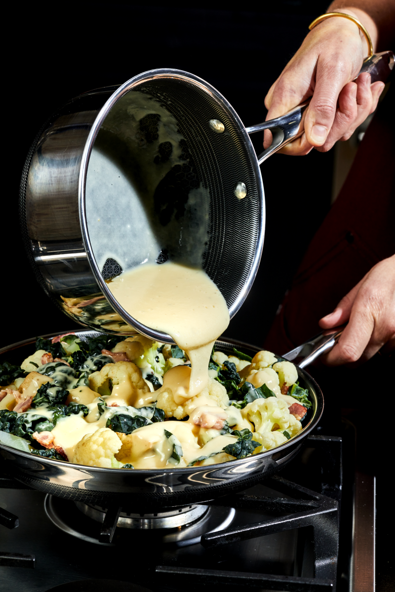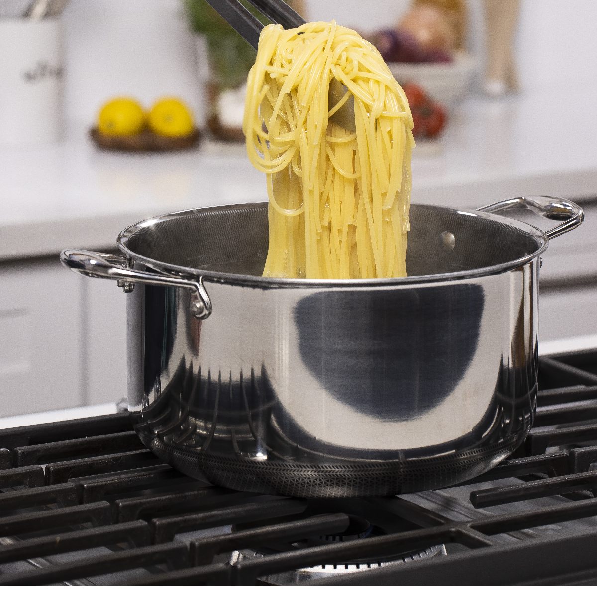 Hexclad kombinerer det beste fra tre verdener: slitestyrken til støpejern, responsen til stål og brukervennligheten til non-stick – alt i ett. Med sin patenterte teknologi og TerraBond™ keramiske non-stick-belegg (fri for PFAS og PTFE), får du gryter som tåler metallredskaper, krever minimalt med fett og likevel gir perfekte resultater – enten du lager en delikat saus eller langtidskoker kraft.