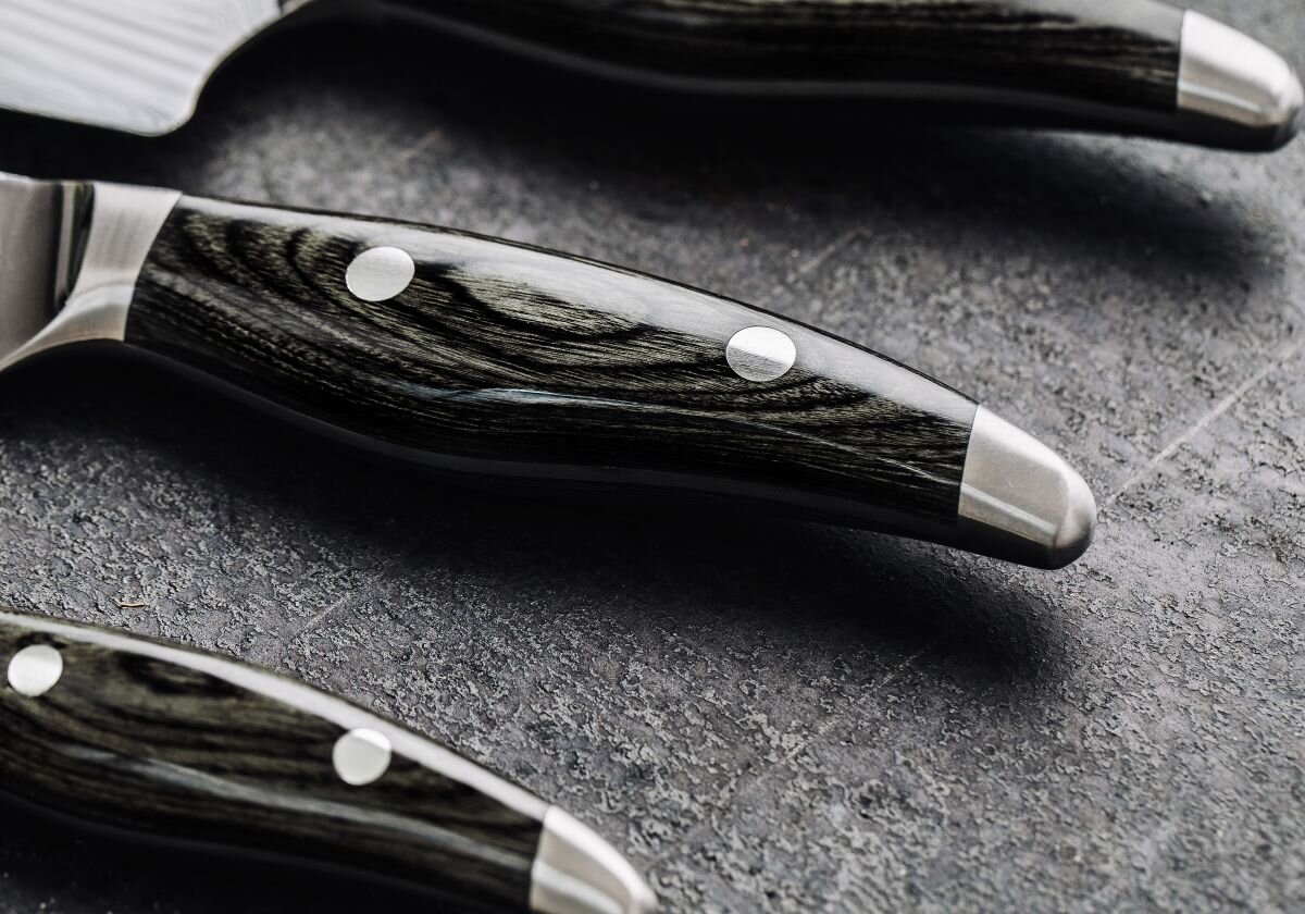 Det ergonomiske håndtaket i gråsvart pakkawood hviler perfekt i hånden og gir både balanse og styrke – et resultat av nøye smidd tange og høy materialkvalitet.