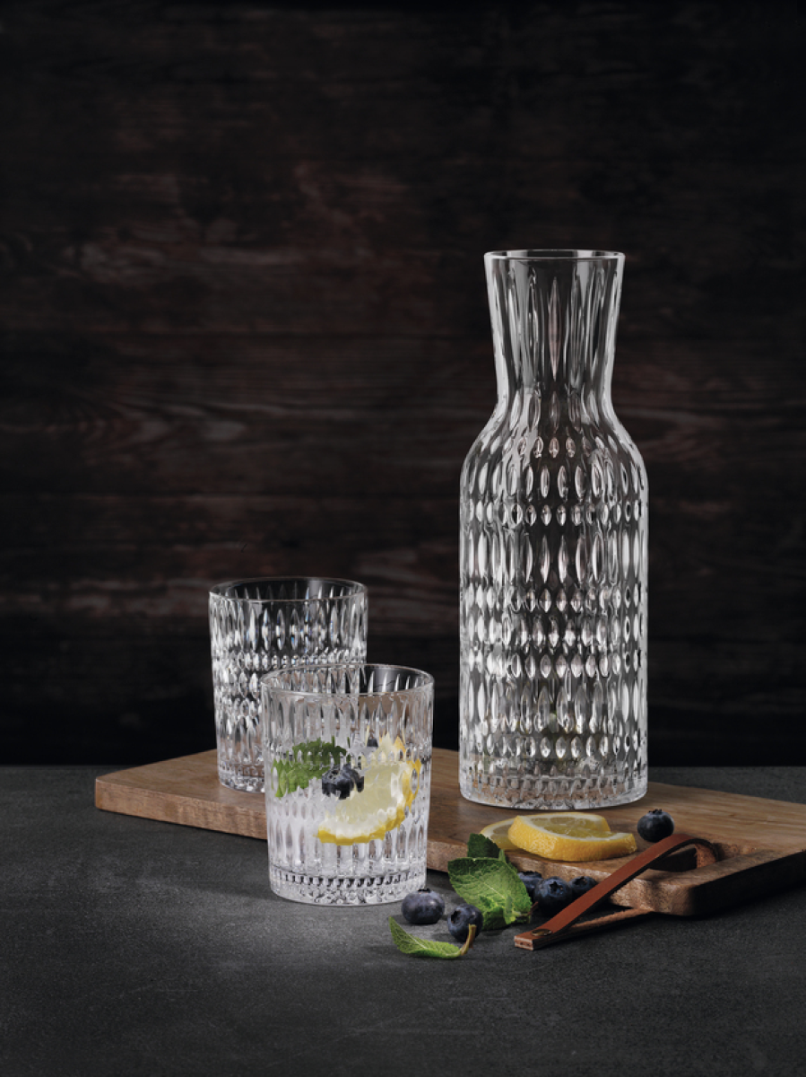 NACHTMANN Ethno karaffel, 1 liter – et stilfullt og funksjonelt valg for profesjonell servering og eksklusive firmagaver. Karaffelen i krystallglass har et dekorativt mønster som reflekterer lyset på en elegant måte, og gir bordet et luksuriøst preg. Den store åpningen med dryppfri tut gjør det enkelt å helle uten søl, og den rommer en liter – perfekt til vann, juice eller annen drikke på kontoret, i kantinen eller i serveringssammenheng. Tåler oppvaskmaskin, og kombinerer praktisk bruk med tidløs eleganse.