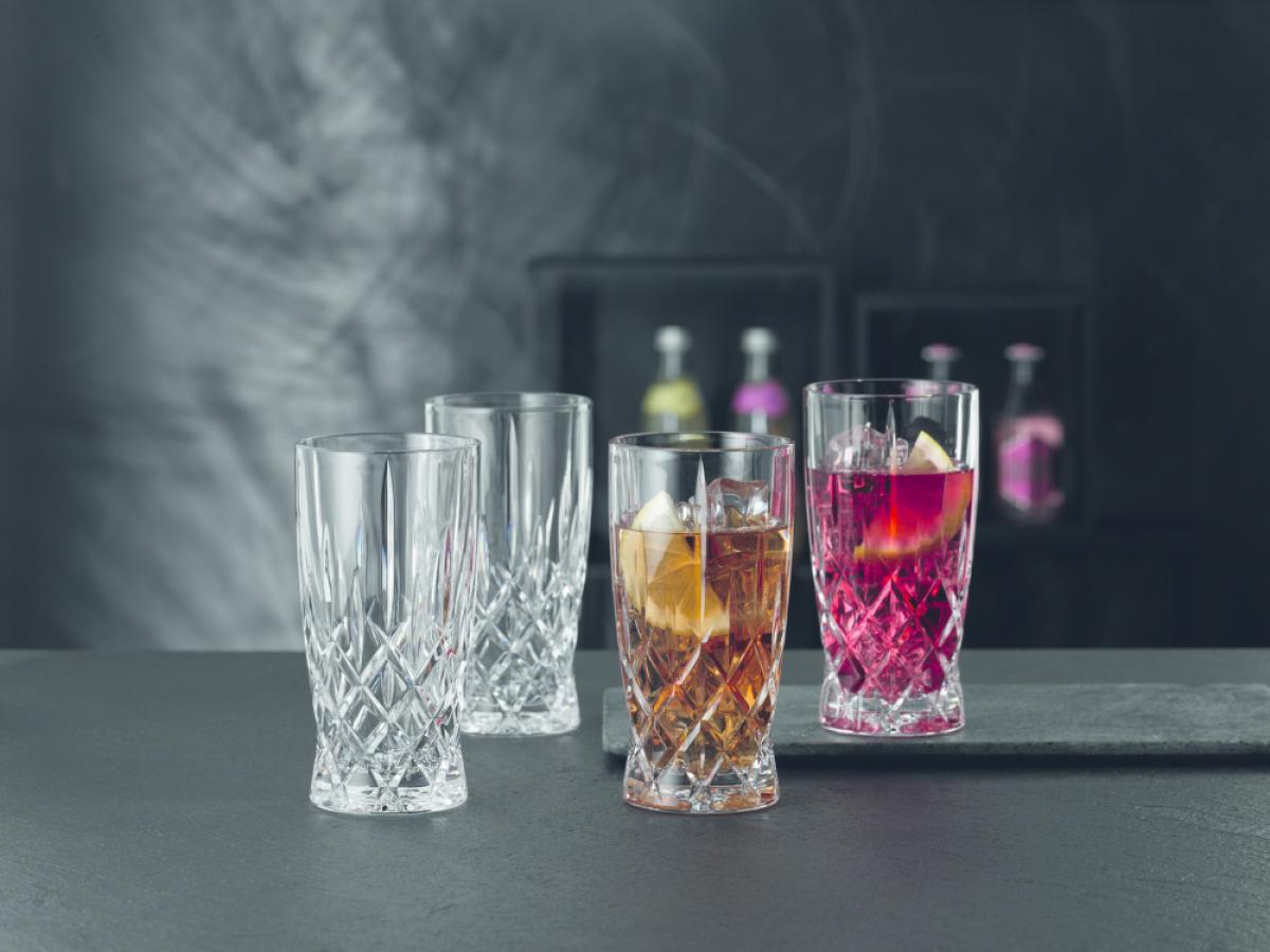 Brusglassene rommer 350 ml og er 146 mm høye, noe som gjør dem perfekte til alt fra mineralvann og juice til cocktails eller longdrinks. Leveres som sett á fire i gaveeske – en gave som både imponerer og blir brukt.