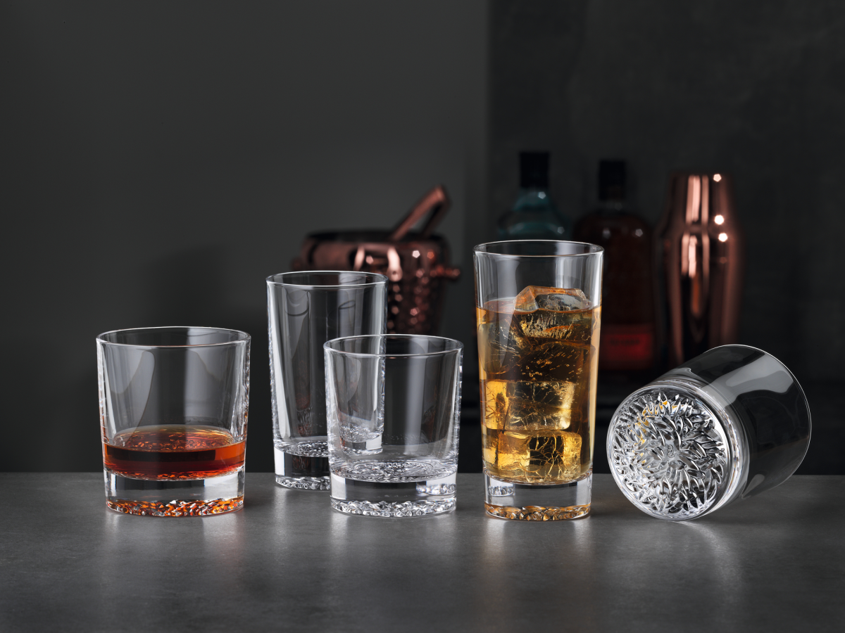 Glassene kombinerer estetikk og funksjonalitet: det rene og minimalistiske designet med et subtilt mønster i bunnen, samt en tykk isbase, fremhever drikkens farge og skaper et visuelt tiltalende uttrykk. Høykvalitets krystall gir den karakteristiske klangen og tåler oppvaskmaskin for enkel rengjøring.